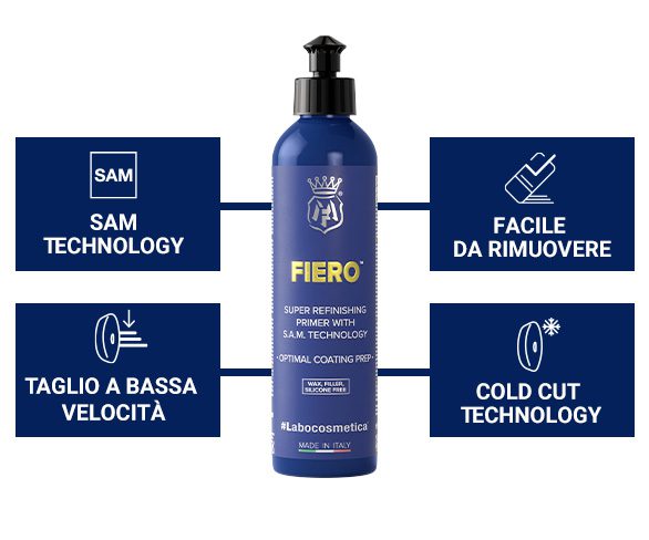 Il nostro primer è stato progettato proprio per preparare la superficie alla successiva fase di applicazione coating grazie all’innovativa tecnologia S.A.M. (Self Assembled Monolayer), garantisce un link forte e duraturo tra la superficie ed il coating nanoceramico applicato compreso il nostro sigillante CUPÌDO. I primer tradizionali che utilizzano resine e riempitivi per ottenere una eccellente rifinitura, hanno bisogno di tempi lunghi per linkare sulla vernice, di solito dalle 6 alle 12 ore di attesa! Con FIERO tutto questo non avviene perché permette l’applicazione del coating scelto subito dopo la fase di rifinitura, facendo così risparmiare molto tempo al detailer. FIERO è un super rifinitore sincero, non teme IPA ed è compatibile con tutti i coating che richiedono lampade UV senza nessun calo di Gloss.